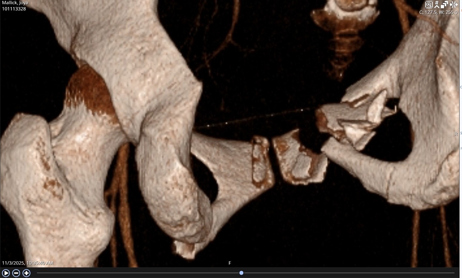 - Multiple shattered pelvic bones